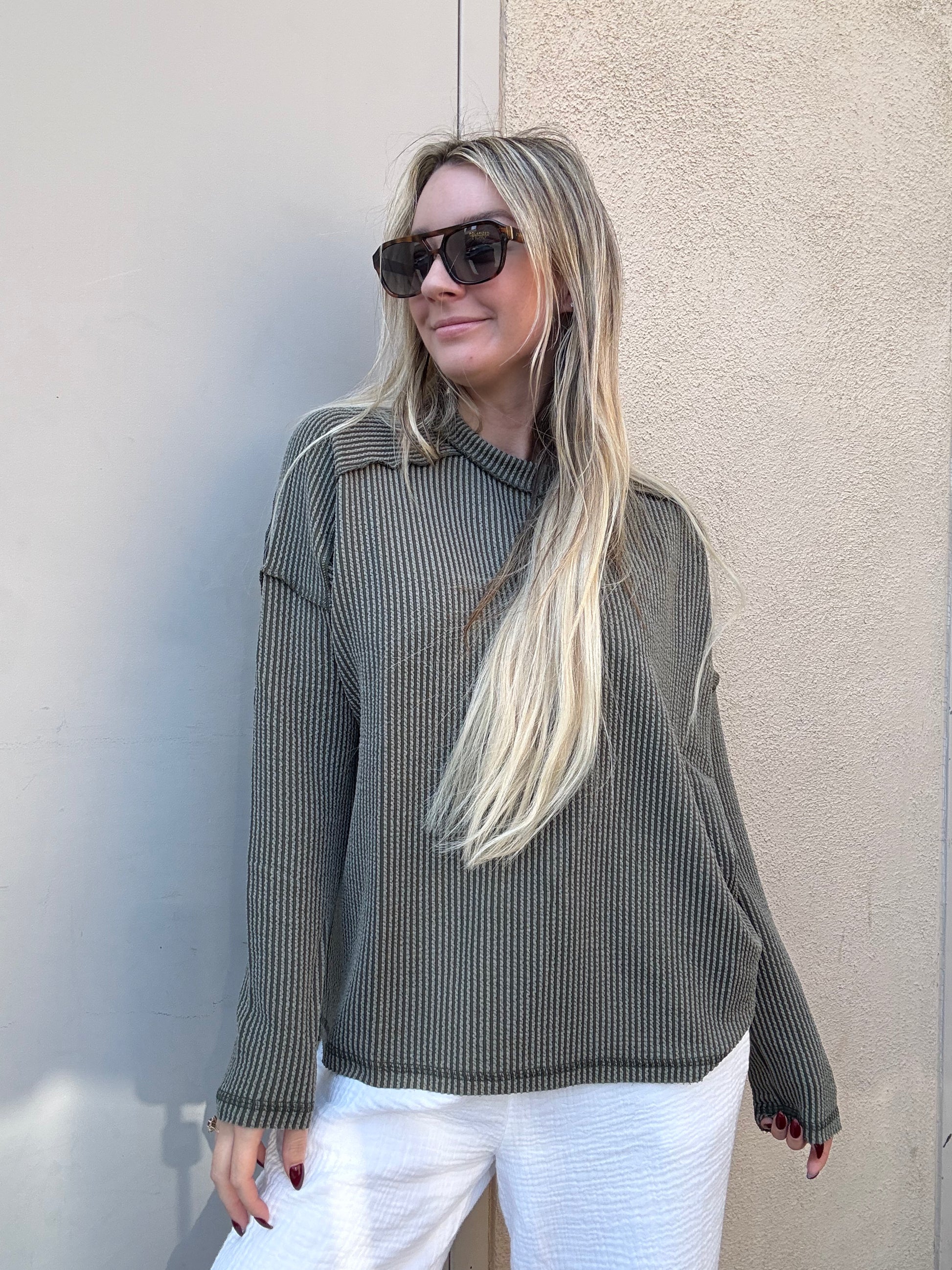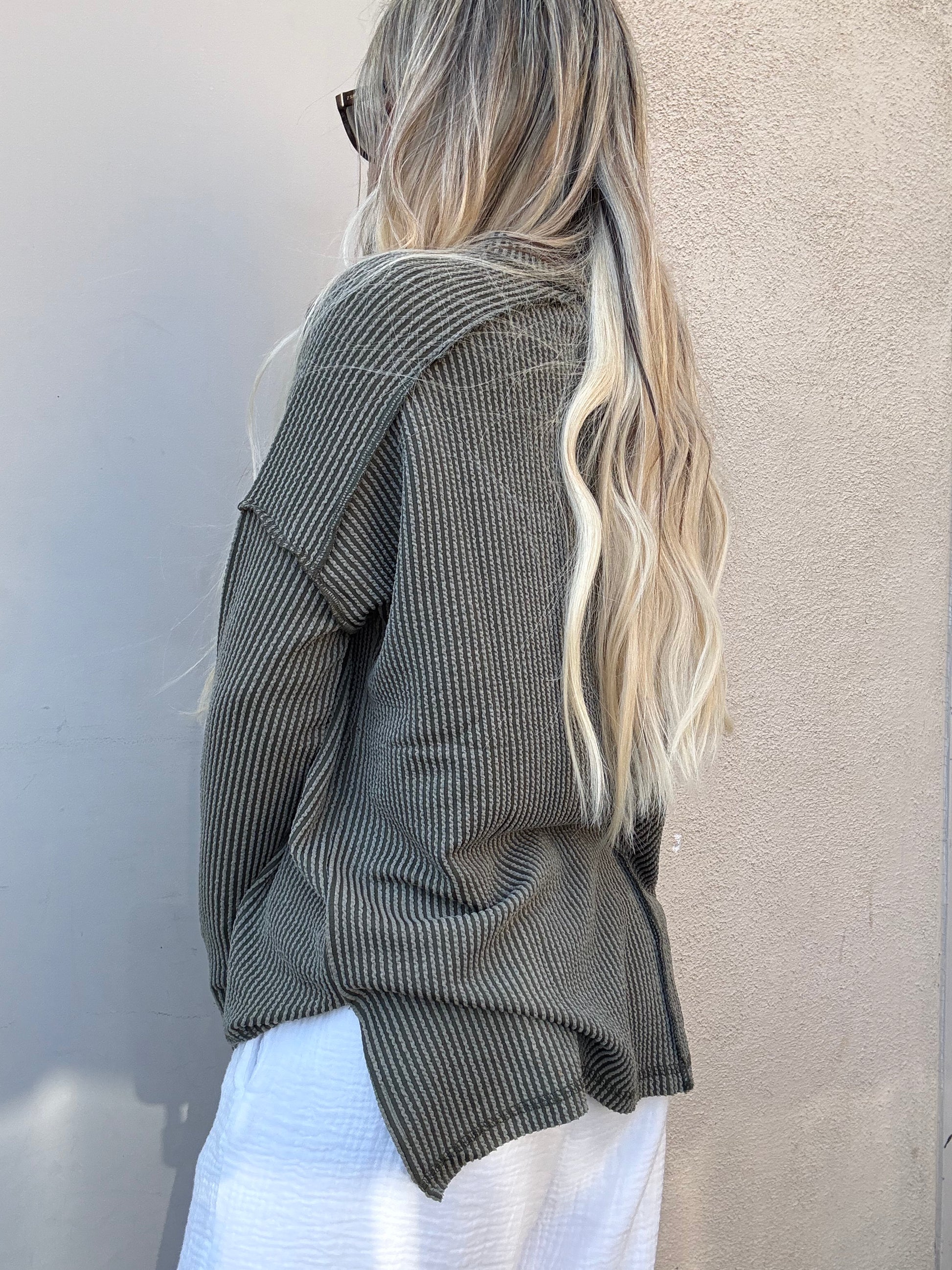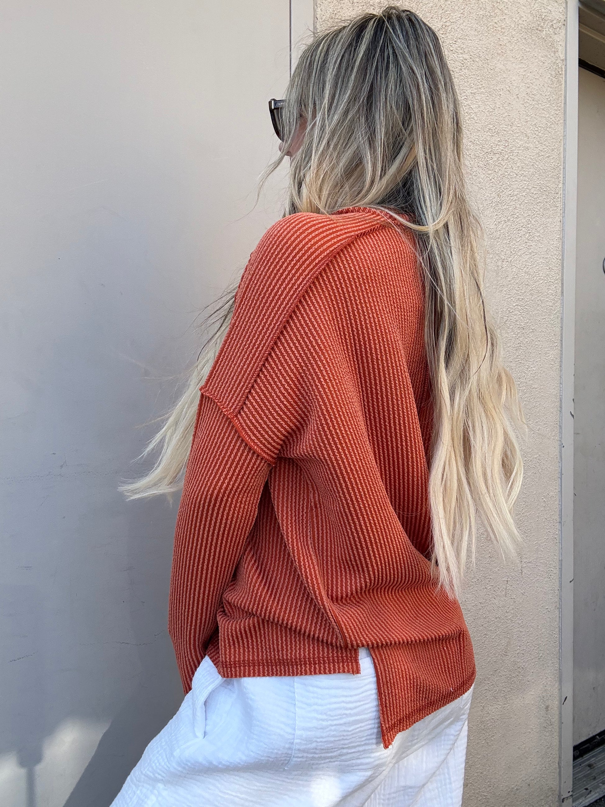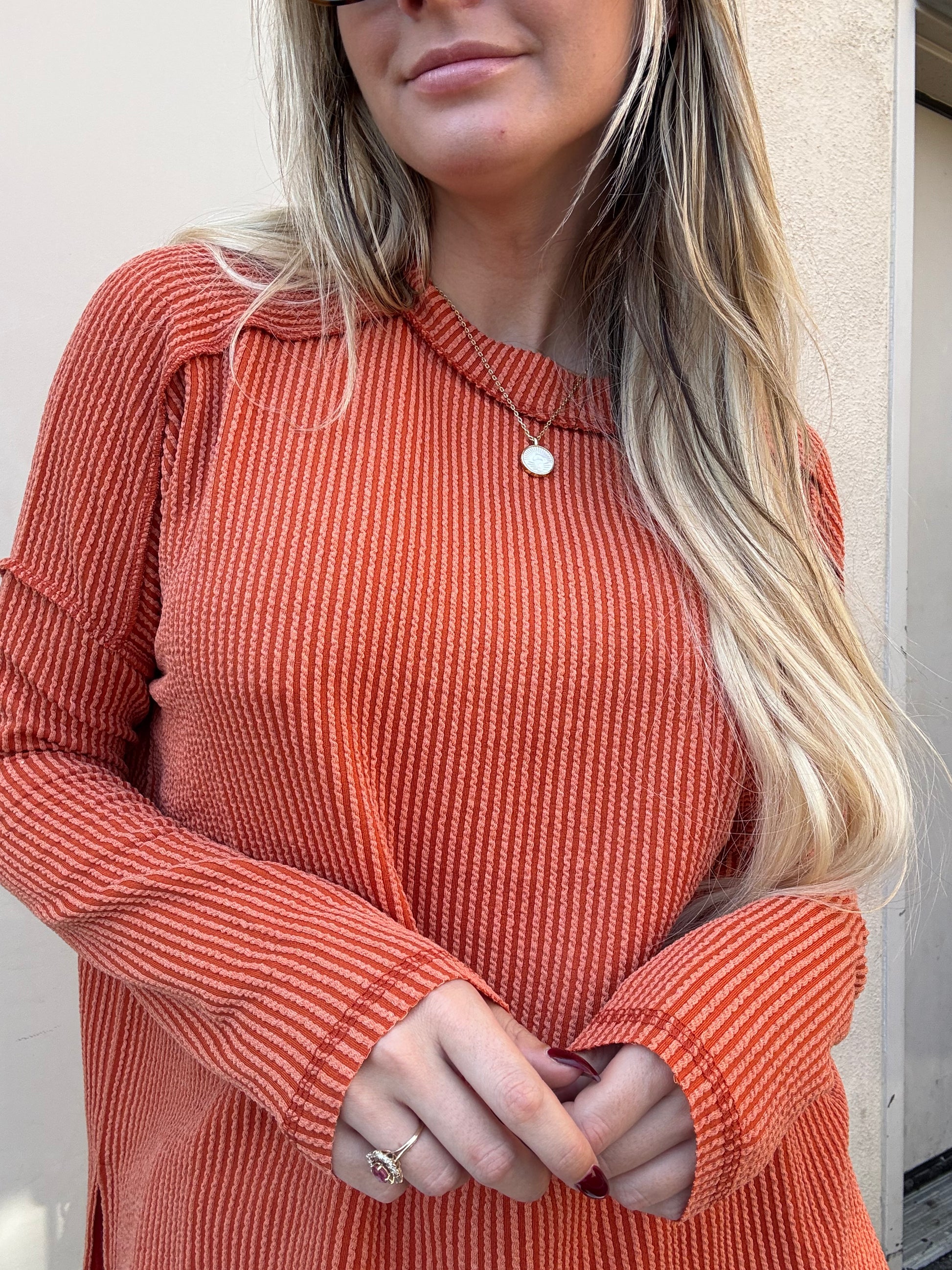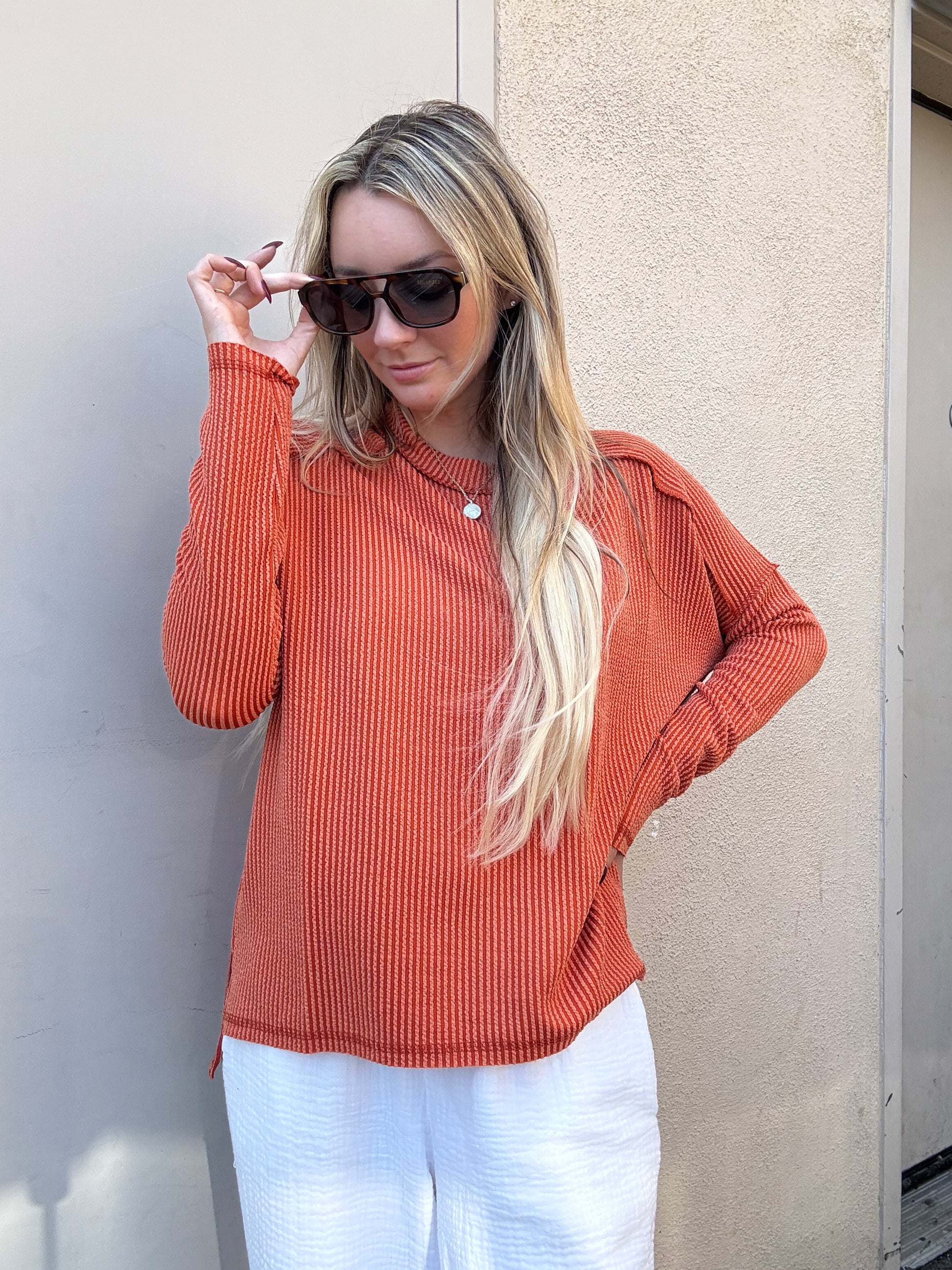 Meet The Ashlyn, your new go-to long sleeve top with a playful twist. Featuring a raised rib texture and a raw edge boat neck, it adds a fun, flirty vibe to your everyday look. Perfect for layering or wearing solo, this top brings effortless style and comfort to your wardrobe.