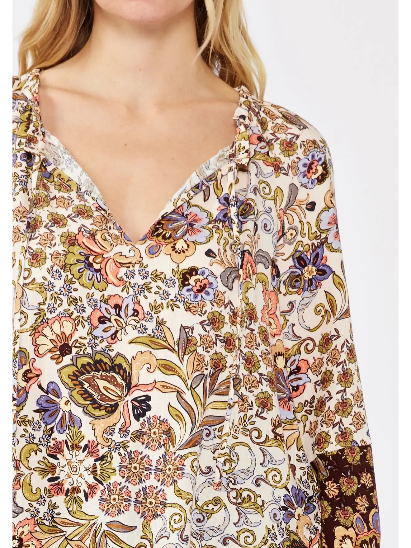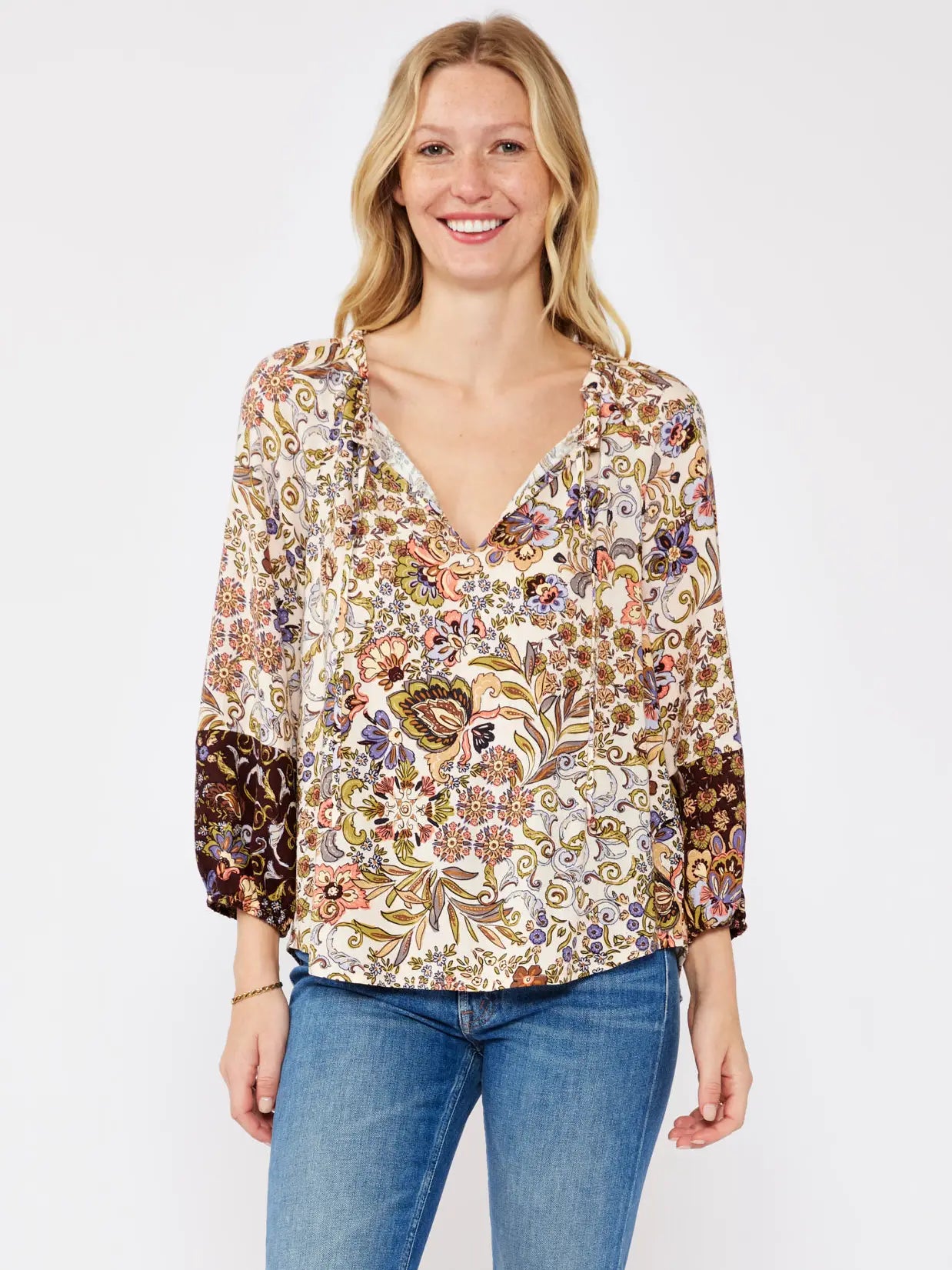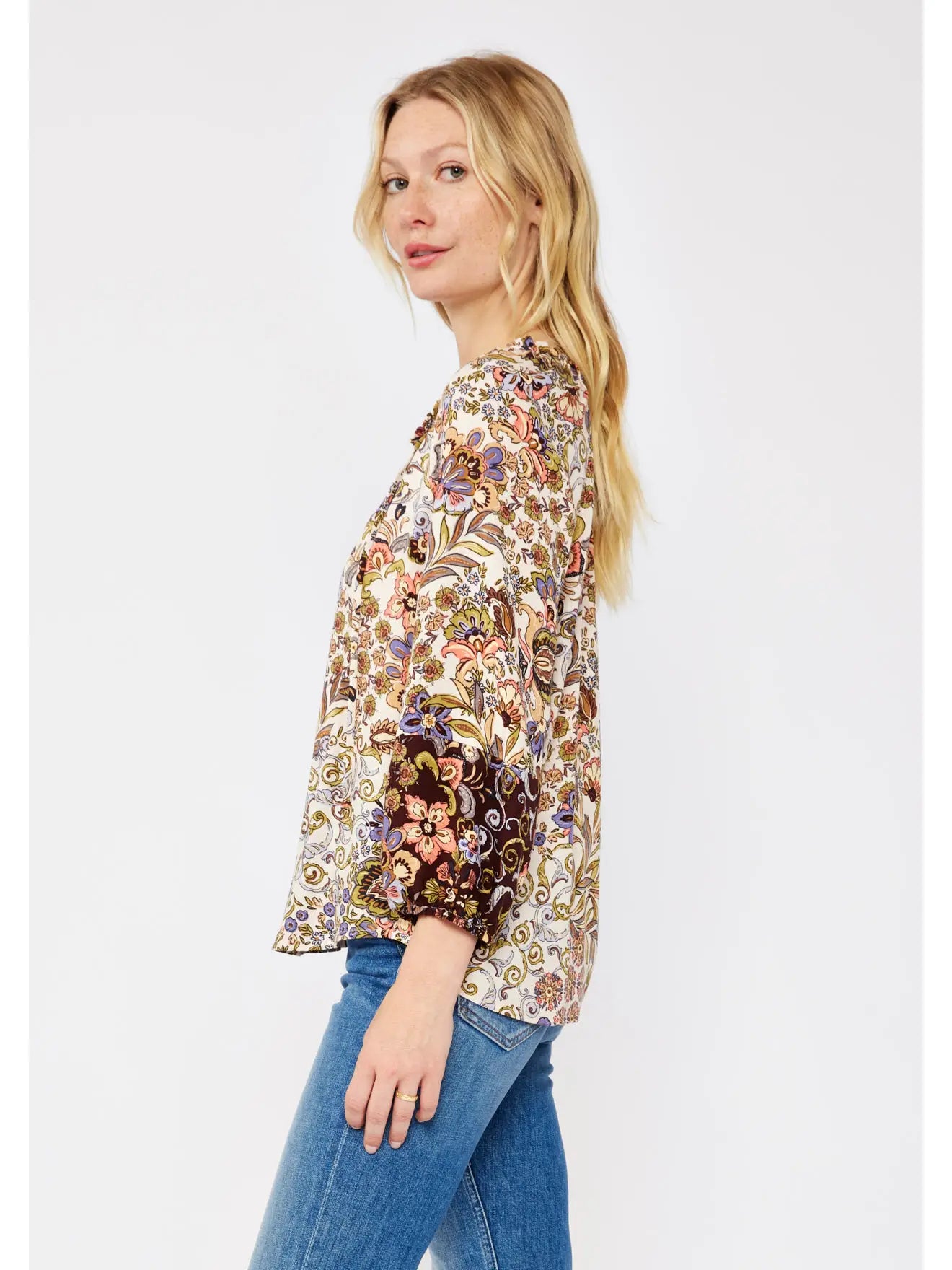 This charming top features a playful floral pattern and a flattering V-neckline, perfect for adding a touch of whimsy to your wardrobe. The 3/4 sleeves offer just the right amount of coverage, making it ideal for transitioning between seasons with ease and style.