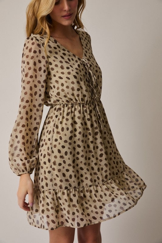 Introducing The Bewilder: a flowy, dot-printed mini dress that will have heads turning! Its playful design and lightweight fabric make it perfect for any occasion. Get ready to bewilder everyone with your fashion sense!