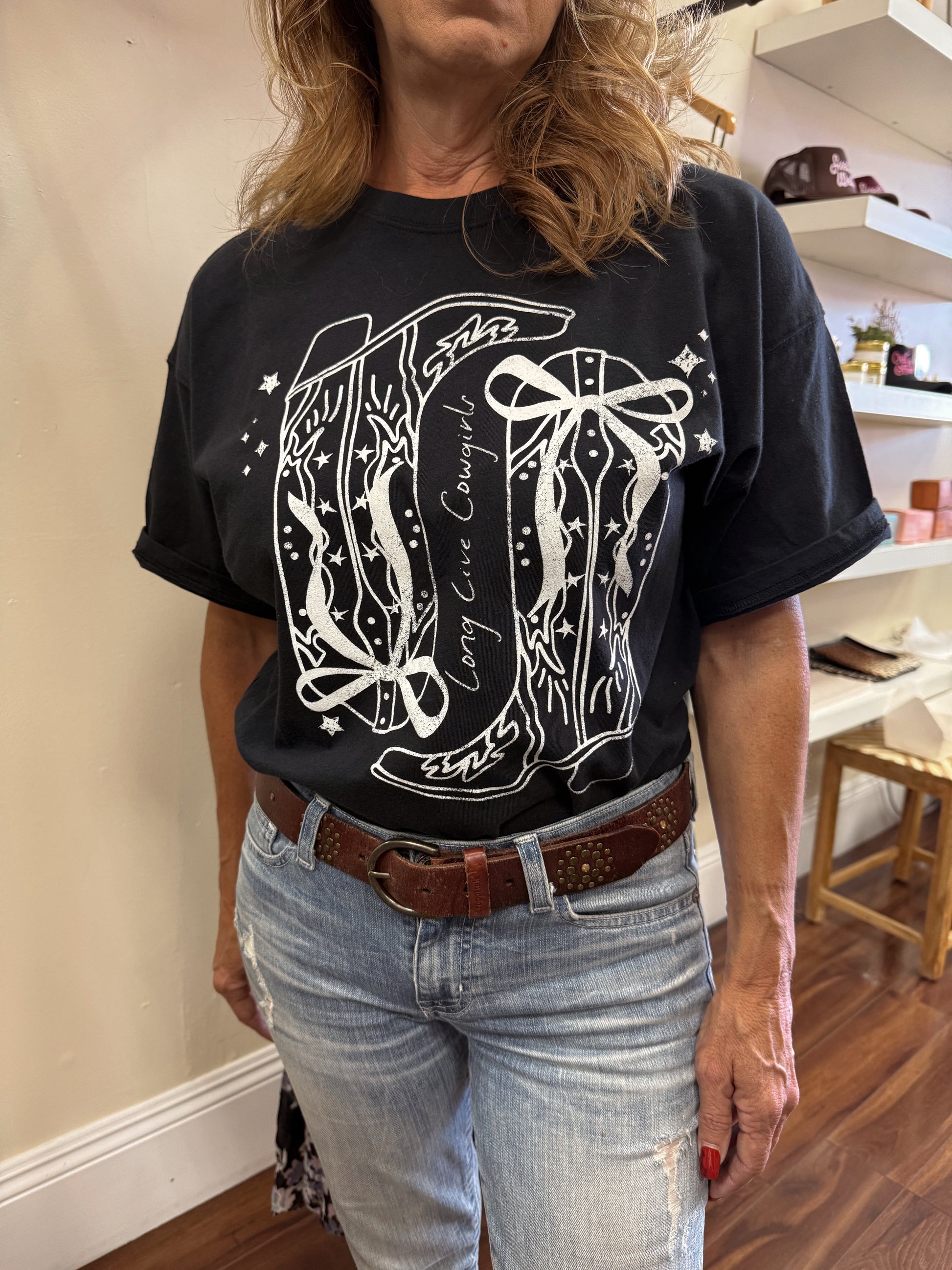 Saddle up with The Bow n Boots! This western-inspired t shirt features a playful print of cowboy boots, making it perfect for any cowgirl or cowboy. Show off your unique style with this quirky and humorous tee. Yee-haw!