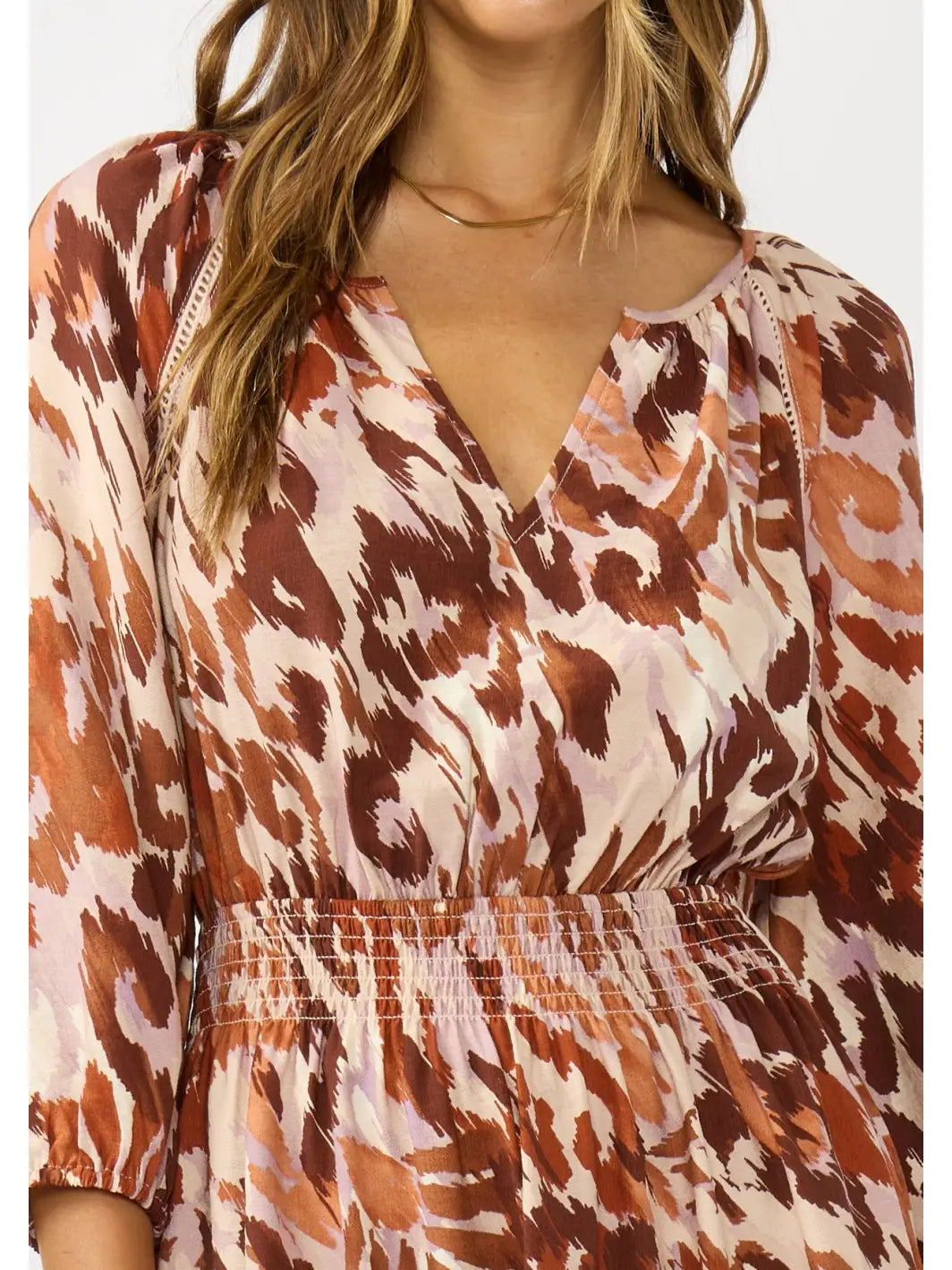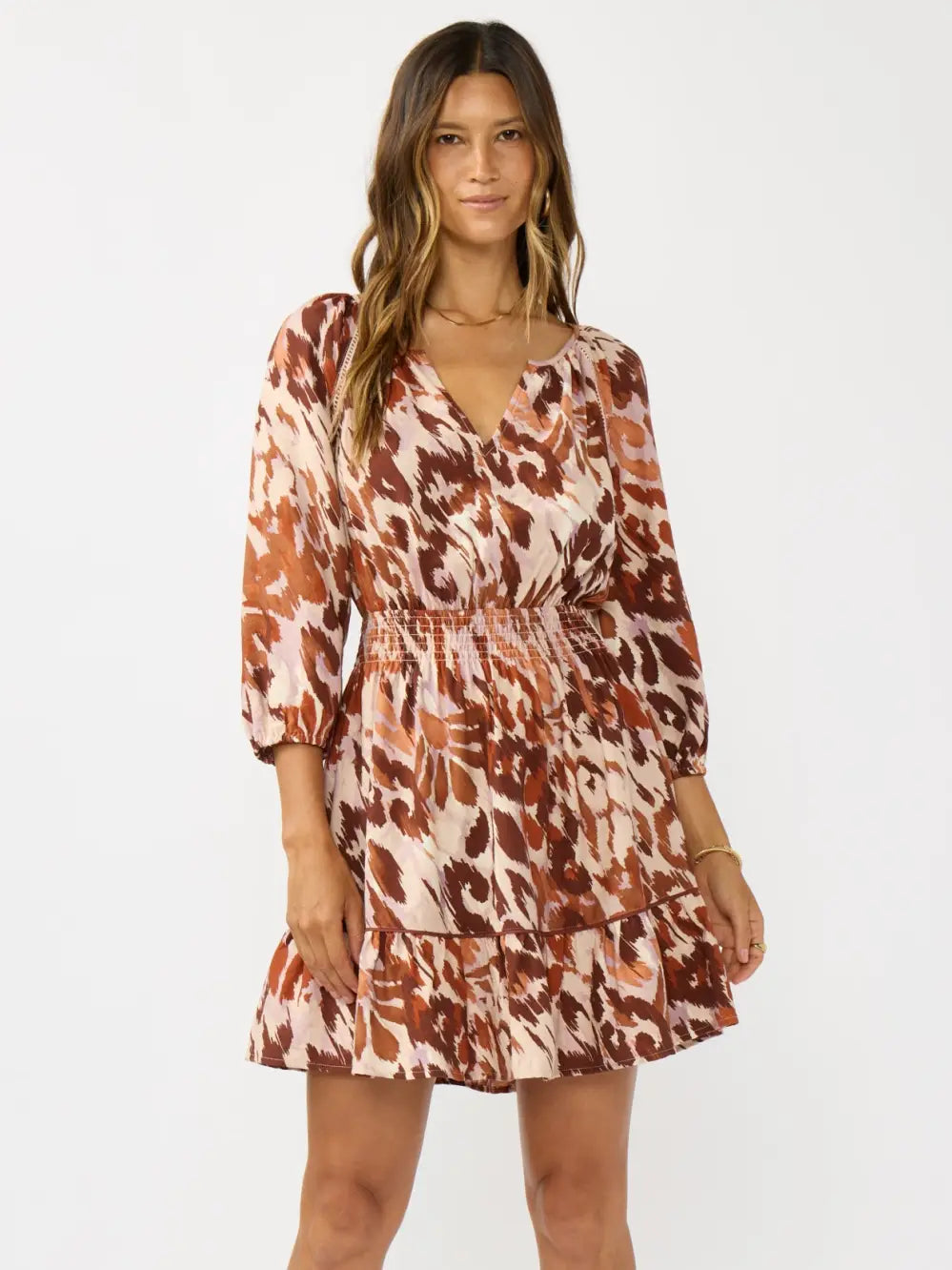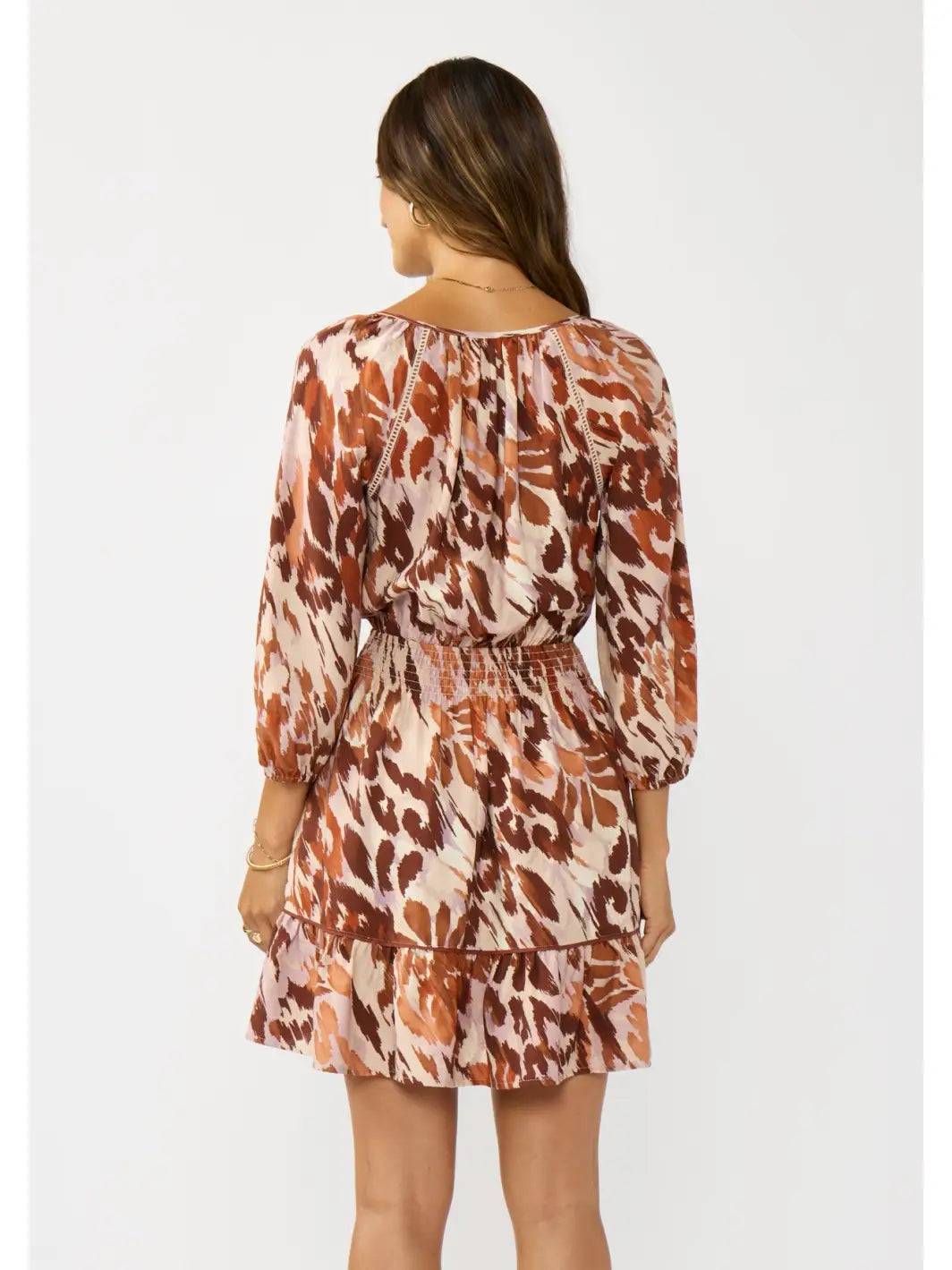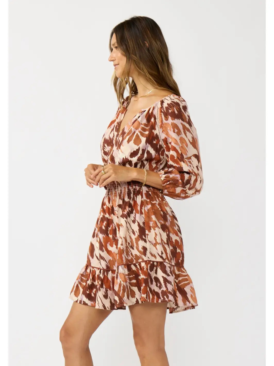 Sunshine never looked so good! This breezy mini dress in crinkle gauze is your new go-to for effortless style. The split neckline with delicate self-binding and ladder lace-trimmed raglan seams create a chic, modern silhouette, while the smocked waist keeps things comfy and flattering. Full 3/4 sleeves and a ruffled hem add that perfect touch of whimsy—ideal for those in-between seasons when you want to feel light, playful, and undeniably fabulous.