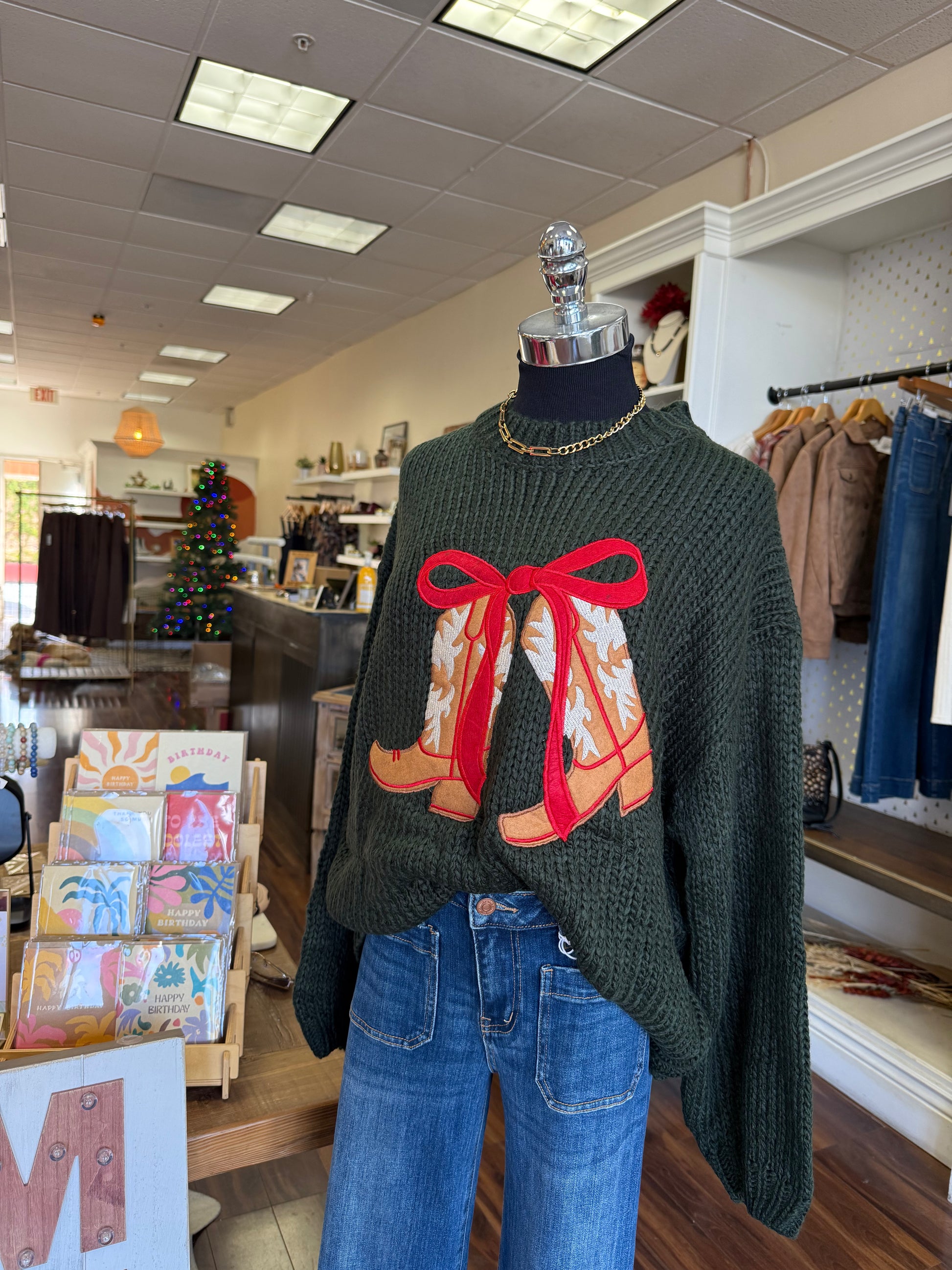 Spread some holiday cheer with a perfect blend of fashion and festiveness. These cowboy boots feature a unique ribbon net sweater design that will make your feet feel cozy and stylish. Get into the Christmas spirit with this festive look. Yee-haw!