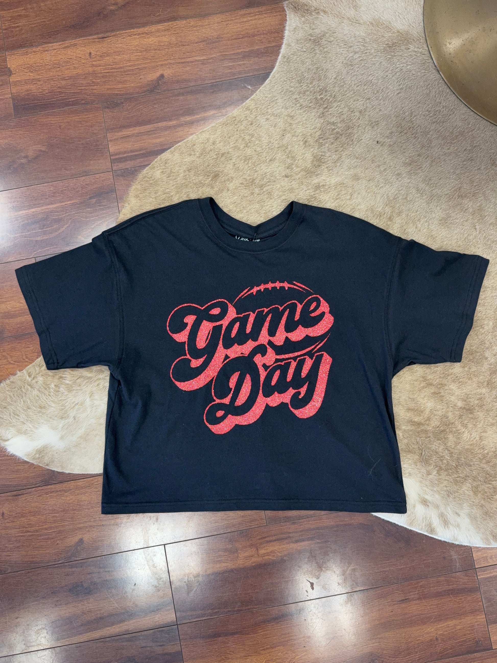"Sparkle on the sidelines with our Game Day glitter long crop tee! Perfect for showing your support and catching the light at the same time. Be the talk of the tailgate in this eye-catching top. Game on!"