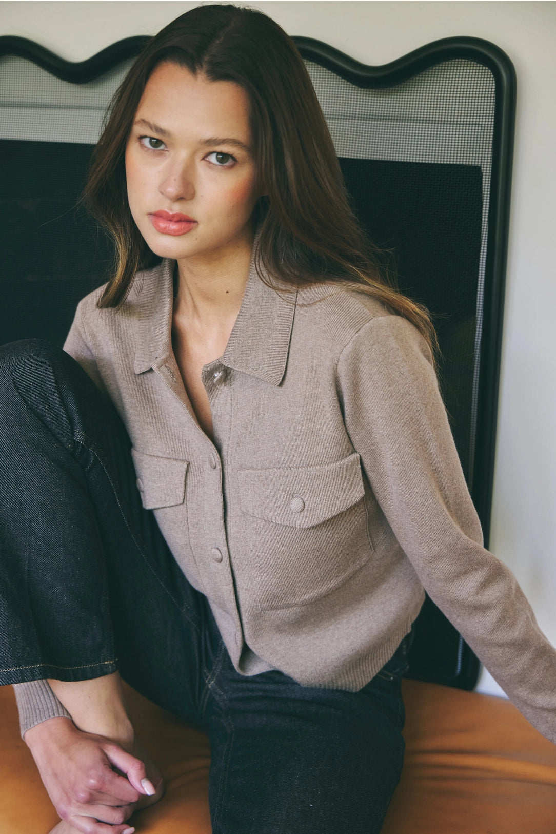The Livermore is your new go to for effortless cool. This cropped knit cardigan features a relaxed boxy silhouette with a collared neckline and functional buttons that actually work. Long sleeves and oversized chest patch pockets with flaps add practical charm, while the crop length keeps things modern and playful. Perfect for layering through fall and winter throw it over everything.