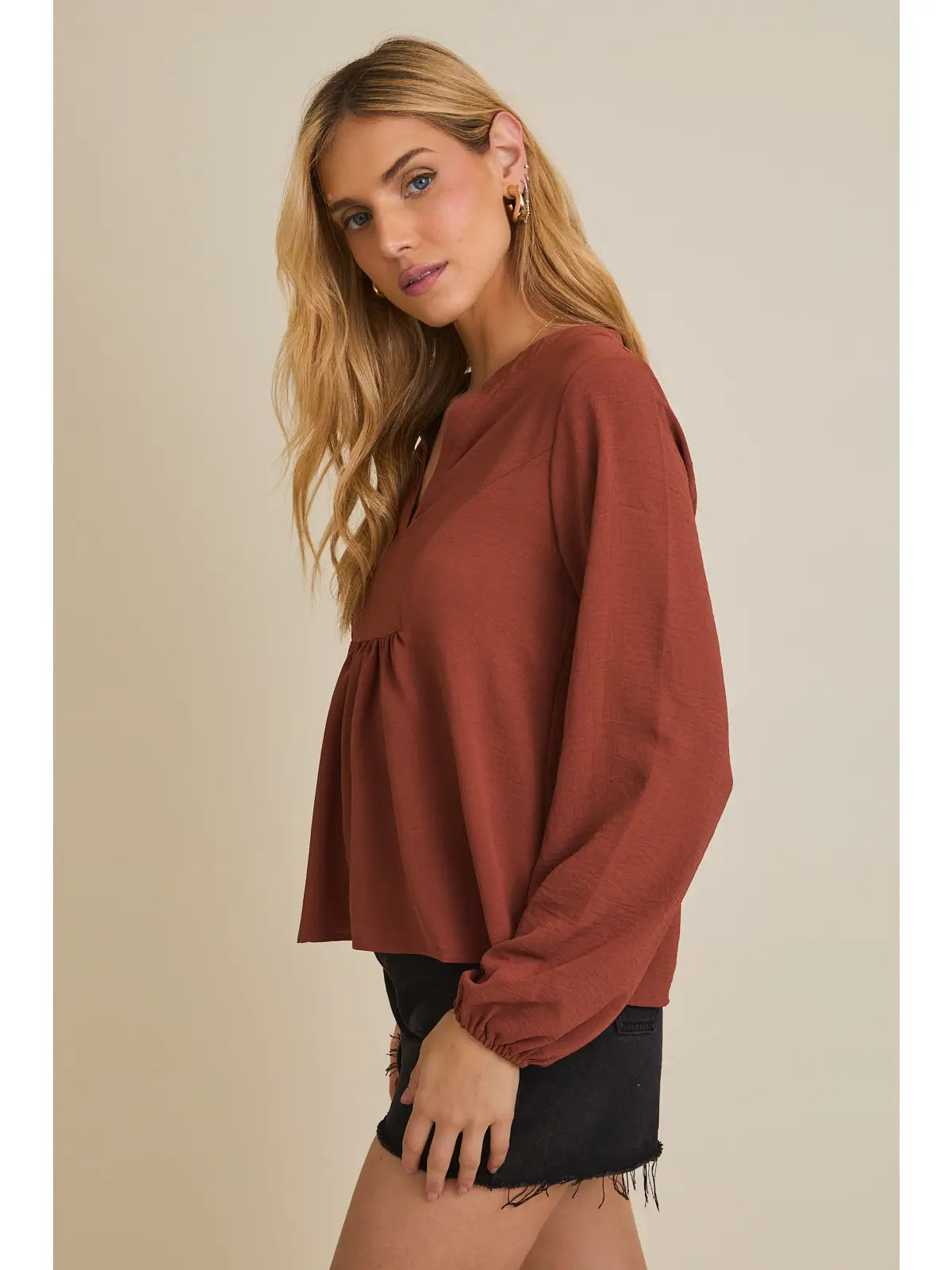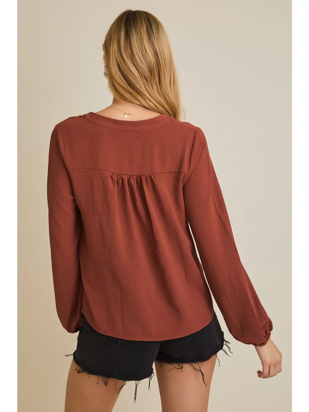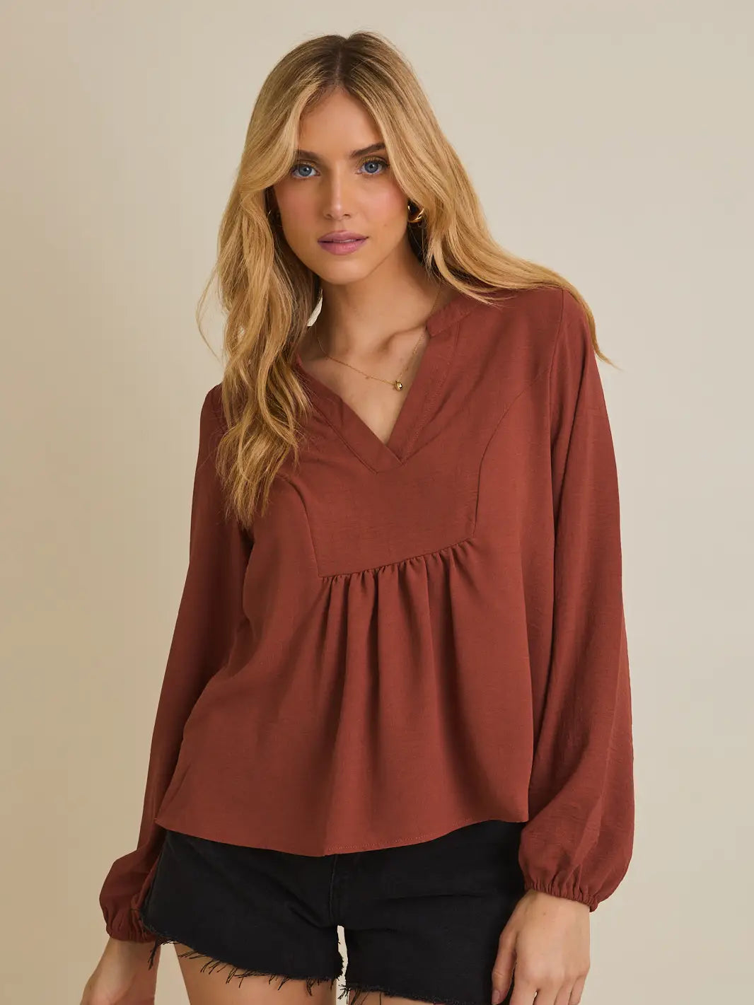 Embrace the cozy vibes of fall with The Marley, a playful long sleeve rust V-neck top perfect for those crisp transition days. Its warm, earthy hue pairs effortlessly with your favorite jeans or skirts, while the flattering neckline adds a touch of charm to your everyday look. Stay comfy and stylish as the seasons change!