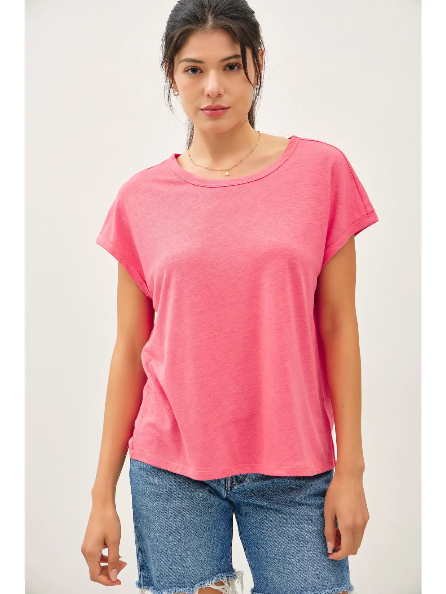 Embrace effortless style with The Passion, a playful cap sleeve tee crafted from a breezy linen blend. Its boxy cut and raw seam details add a cool, undone vibe perfect for sunny days and casual adventures. Light, comfortable, and full of character, this tee is your new go-to for easy, chic looks.