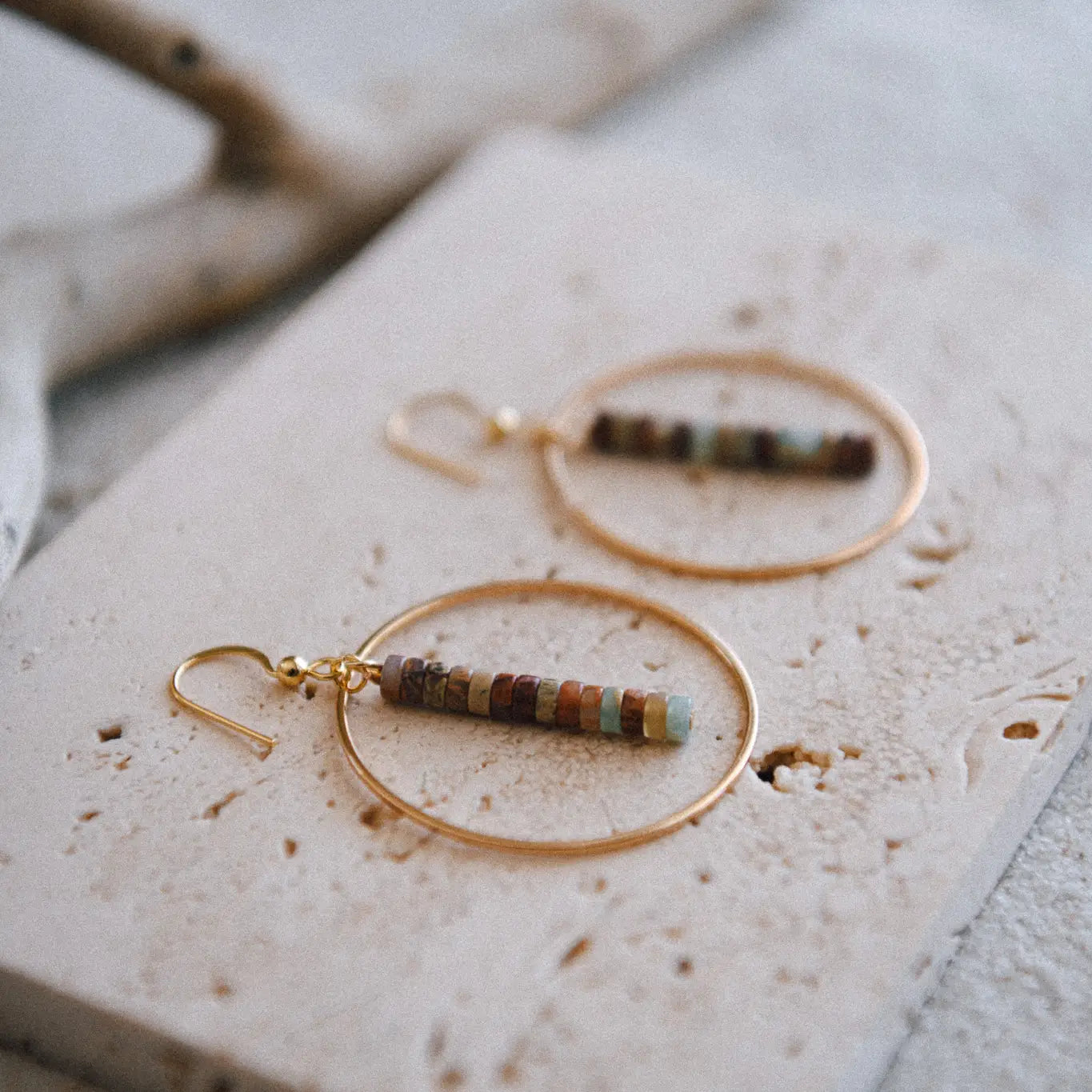 Earthy elegance meets modern minimalism. These handcrafted hoop earrings feature a vertical stack of natural serpentine and turquoise heishi beads, suspended within a delicate gold-plated hoop. The soft greens, browns, and aqua hues echo desert landscapes and timeless bohemian style—perfect for adding a warm, grounded touch to any look. Lightweight and versatile for everyday wear or as a subtle statement piece.