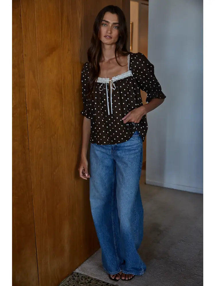 Add a dash of fun to your wardrobe with The Semi Sweet blouse. Featuring a charming polka dot print, a square neckline, and flattering quarter sleeves, this top is topped off with delicate front lace and strap details for an extra touch of whimsy. Perfect for brightening any day, it’s your new go-to for effortless playful style.
