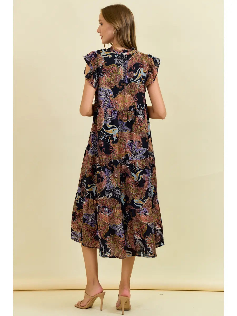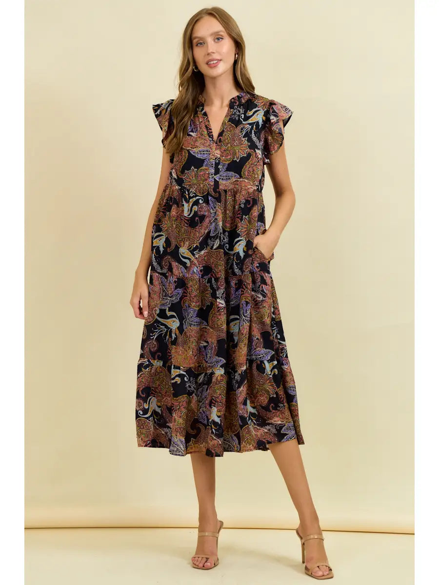 Embrace playful elegance with The September midi dress, featuring a charming paisley print and a relaxed fit that flatters every shape. Its tiered skirt dances with every step, while the split neckline adds a flirty touch. Feminine ruffle sleeves finish the look with soft, stylish flair—perfect for turning heads wherever you go.